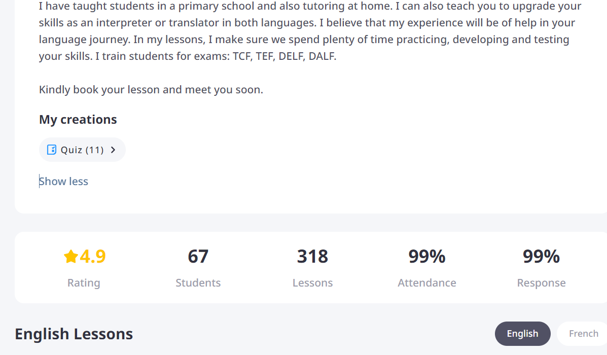 I love teaching French and find great satisfaction in helping my students reach their personal or academic goals.